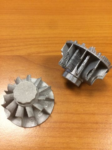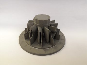 Dans le cadre du projet PEPS, nous avons souhaité comparer le maximum de technologies de fabrication additive dit « PIM like » disponibles sur le marché sur des turbines métalliques. Les technologies choisies pour cette étude comparative sont la technologie SLM (Lit de poudres avec faisceau laser ), la technologie Binder Jetting ( Lit de poudres avec cartouche d’impression) , la technologie FFF (Fused Filament Fabrication : Bobine de filaments chargés de métal) et la technologie FFD (Fused Feedstock Deposition : Extrudeur à granulés chargés métal monté sur une imprimante type FFF). Ces 3 dernières technologies ont nécessitent les post-traitements de déliantage et de frittage pour obtenir les pièces métalliques.